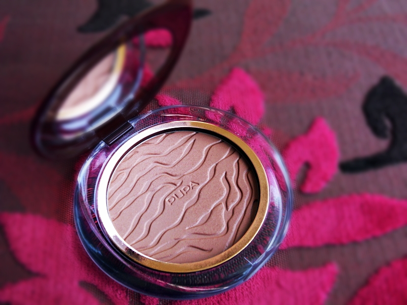 Do domu wróciłam z pudrem rozświetlająco-brązującym firmy Pupa. Najciemniejszy odcień 03 okazał się idealnym dla mnie, zadowalająco chłodny tworzy bardzo naturalny efekt skóry muśniętej słońcem. Chłodne drobinki, całkowicie niewidoczne na twarzy, dają efekt rozświetlenia nie wspomagając przy tym błysku/świecenia twarzy.